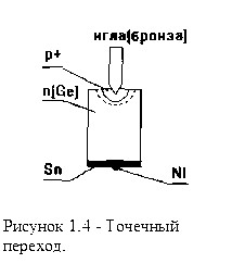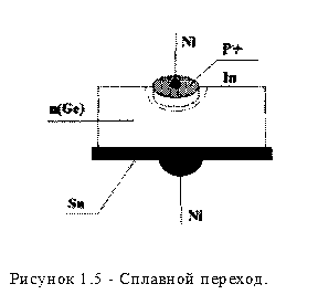 Образуются точечно-контактным способом (рис. 1.4.). К полированной и протравленной пластине монокристаллического полупроводника n-типа подводят иглу, например из бериллиевой бронзы с острием 20-30 мкм. Затем через контакт пропускают мощные кратковременные импульсы тока. Место контакта разогревается до температуры плавления материала зонда, и медь легко диффундирует внутрь полупроводника образуя под зондом небольшую по объему область p-типа. Иногда перед электрической формовкой на конец иглы наносят акцепторную примесь (In или Аl), при этом прямая проводимость контакта доходит, до 0,1 см. Таким образом, электронно-дырочный переход образуется в результате диффузии акцепторной примеси из расплава зонда и возникновения под ним области p-типа в кристаллической решетке полупроводника n-типа. Точечные переходы применяют при изготовлении высококачественных диодов для радиотехнического оборудования. 1.3.2 Сплавные переходы.
