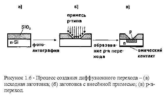 Иногда, для образования омического контакта с областью n-типа, на неё напыляют сплав Au-Sb, содержащий примерно 0,17% сурьмы, и вплавляют его при температуре 40°С. 1.3.3 Диффузионные переходы.Диффузионные переходы получают диффузией примесного вещества в исходную полупроводниковую пластинку (рис. 1.6.). Это один из наиболее широко используемых методов получения p-n-перехода, он имеет несколько разновидностей. При планарном методе диффузии переходы получают, используя изолирующий слой, препятствующий диффузии примесей. На поверхности кремния n-типа выращивается тонкий (около 3 мкм) слой двуокиси кремния SiO2 (рис. 1.6.). Фотолитографическим методом в определенных местах окисла получают «окна», через которые диффундирующие примеси проникают в n-слой, образуя переход. Методы диффузии обеспечивают получение плавных p-n переходов и используются при изготовлении интегральных микросхем.