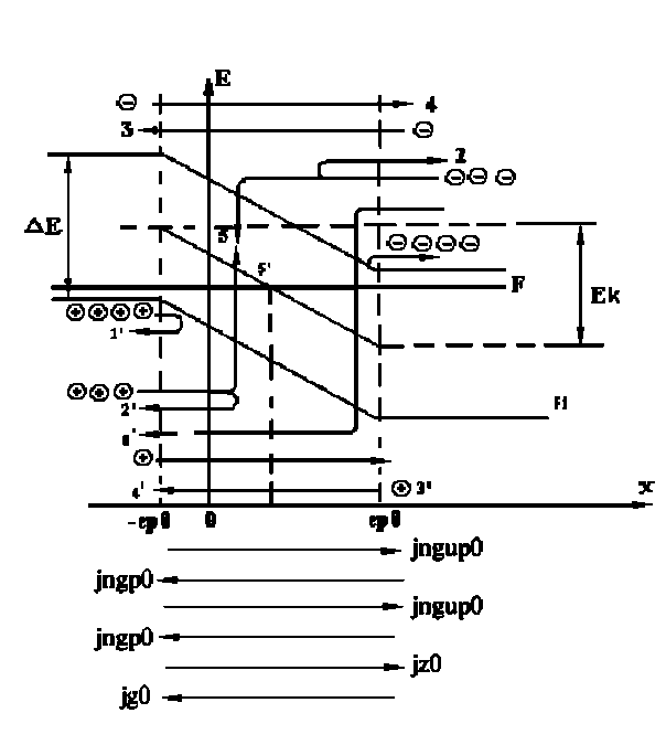 На оси ординат отложена энергия электрона Е. Энергия дырок на диаграмме возрастает в направлении - Е. Так как частицы стремятся занять состояние с минимальной энергией, электроны на диаграмме имеют тенденцию «утонуть», а дырки «всплыть». При отсутствии вырождения, общий для всей системы уровень Ферми расположен внутри запрещенной зоны, ширина которой не зависит от координаты. Уровень электростатической энергии F, показан на рис. 1.9. пунктиром, соответствует положению уровня Ферми в собственном полупроводнике и расположен вблизи середины запрещенной зоны. Энергетические уровни изображены горизонтальными прямыми. Это выражает тот факт, что энергия электрона, находящегося на данном уровне, например, на дне зоны проводимости, во всех точках полупроводника одинакова. После установления равновесия, образуется р-n–переход с потенциальным барьером для основных носителей равным j0= qVk. Электроны, переходящие из n- в р–область, преодолевая этот барьер, увеличивают свою потенциальную энергию на j0 = qVk. Поэтому все энергетические уровни полупроводника, искривляясь в область p-n-перехода, поднимаются вверх на Ек, как показано на рис. 1.9. При этом уровни Ферми F0 и F устанавливаются на данной высоте, как в случае двух металлов. В электрических нейтральных областях эмиттера (х<-lр0) и базы (х>ln0) поле равно нулю, и уровни Ес (энергия, соответствующая дну зоны проводимости), Еv (энергия, соответствующая потолку валентной зоны), Fi (электрическая энергия); располагаются горизонтально. В области p-n-перехода (-lp0<х<ln0) электрическое поле направлено справа налево (вдоль градиента Fi). Равновесная концентрация носителей заряда в отсутствии вырождения определяется взаимным расположением уровней F и Fi. nо = ni ехр [(F - Fi) / kT ] (1.4.1) pо = ni ехр [(Fi - F ) / kT ] (1.4.2) В эмиттере p-типа (х<Lp0) фермиевская энергия меньше электрической энергии:F<Fi, pр0> nр0 В базе n-типа: F > Fi, nn0 > pn0 В плоскости физического перехода Х-Хф выполняется условие: Fi(Xф) =F Ввиду искривления запрещенной зоны в области перехода между эмиттером и базой существует энергетический барьер, высота которого равна разности электростатических энергий в n- и p-областях (рис.1.9.). Ек=Fip-Fin Соответственно потенциалы эмиттера и базы отличаются на величину φк=(Fip - Fin)/e, (1.4.3) где jк - контактная разность потенциалов. Энергетический барьер препятствует диффузионным потокам электронов из базы в эмиттер и дырок, из эмиттера в базу. Величина барьера автоматически становится такой, чтобы точно скомпенсировать диффузные потоки. 1.5 Токи через p-n-переход в равновесном состоянии.Рассмотрим зонную диаграмму p-n-перехода. Градиенты концентрации подвижных носителей заряда, а также градиент электрического потенциала в p-n-переходе вызывает появления диффузионных и дрейфовых токов через переход. Механизм протекания токов представлен на рис. 1.9., где дырки изображены кружками со знаком «+», а электроны со знаком «–». Потенциальный барьер создает различные условия для перехода носителей в смежные области. Например, электрон из слоя n может переходить в слой p только в том случае, если он обладает достаточной энергией для преодоления ступени высотой Ек, т.е. если он сможет преодолеть силы электрического поля, выталкивающего его из перехода обратно в n-слой. Переход же электронов из p-слоя в n-слой совершается беспрепятственно, более того, электрическое пол