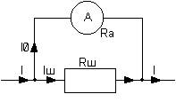 Рис.12 Так как сам амперметр обладает сопротивлением Лд, то при его включении сопротивление всей цепи возрастает, а ток в ней уменьшается при неизменном напряжении в соответствии с законом Ома. Чем меньше сопротивление амперметра, тем меньше изменяется ток в цепи при включении в нее амперметра и тем точнее его показания. Следовательно, сопротивление амперметра должно быть очень малым. Амперметр нельзя подключать к сети без нагрузки, т.к. произойдет короткое замыкание. Любой амперметр рассчитан на измерение сил токов до некоторого rмаксимального значения 1д, т.е. имеет верхний предел измерений. В соответствии с этим различают микро -, милли-, кило - и наноампер-метры. Для измерения токов, больших, чем те, на которые рассчитан амперметр, параллельно ему включается резистор Лщ, называемый шунтом. Рис.13 Сопротивление шунта в несколько раз меньше, чем собственное сопротивление амперметра Дд, поэтому большая часть измеряемой силы тока I пройдет через шунт. Через амперметр должен идти ток, не превышающий Jg, причем эта сила тока меньше измеряемой силы тока I в п раз. Следовательно, цена деления прибора (нижний предел измерений) возрастет в га раз, а его чувствительность уменьшится в п раз. Нужное сопротивление шунта к амперметру можно рассчитать, применяя правила параллельного соединения проводников. При параллельном соединении напряжение на шунте [7щ и амперметре 1/д одинаково 17щ -= Уд.