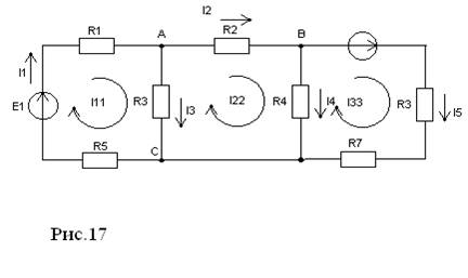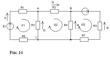 1) Выбираем независимые контуры: R6,E1,R1,R6; R3,R2,R4; R4,E2,R5,R7; 2) Полагаем, что в каждом контуре течет свой контурный ток: I11,I22,I33. 3) Произвольно выбираем их направления. 4) Записываем уравнения по второму закону Кирхгофа относительно контурных токов, для выбранных независимых контуров: I11(R1+R3+R6)-I22*R3=E1 I22(R2+R3+R4)-I11*R3-I33*R4=0 I33(R4+R5+R7)-I22*R4=E2 Подставим численные значения: I11*57-I22*15+0=50 -I11*15+I22*57-I33*18=0 0-I22*18+I33*78=50 5) Решаем полученную систему уравнений через определители: Главный определитель: |57 -15 0| D= |-15 57 -18| = 253422+0+0-0-17550-18468=217404 |0 -18 78| Вспомогательный определитель 1: |50 -15 0| D1= |0 57 -32| = 222300+0+13500-0-0-16200=219600 |50 -18 78| Вспомогательный определитель 2: |57 50 0| |0 50 78| Вспомогательный определитель 3: |57 15 50| |0 -18 50| I11=D1/D=219600/217404=1.01(A) I22=D2/D=109800/217404=0.505 (A) I33=D3/D=-164700/217404=0.757 (A) I1=I11=1.01 (A) I2=I22=-0.505 (A) I3=I11-I22=1.01-0.505=0.505 (A) I4=I22-I33=0.505-0.757=-0.252 (A) I5=I33=0.757 (A) 6)Энергетический баланс мощностей На основании закона сохранения энергии количество теплоты выделяющиеся в единицу времени на резисторах должно равняться энергии доставляемой за это же время источниками энергии.