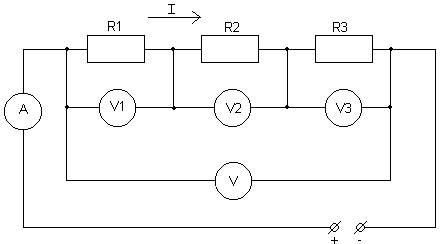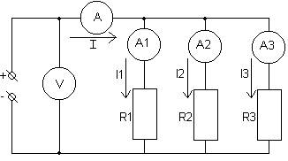 Зависимость сопротивления металлов от температуры используется, например, в термометрах сопротивления. Многие проводники обладают свойством сверхпроводимости, состоящей в том, что их сопротивление скачком падает до нуля при охлаждении ниже определенной критической температуры Т^, характерной для данного материала. Такие вещества получили название сверхпроводники. Впервые это явление наблюдал в 1911 г. нидерландский физик Гейке Камерлинг-Оннес (1853-1926). Он обнаружил, что ртуть при Т = 4,15°К переходит в новое состояние, названное сверхпроводящим (рис. 62). Позже им было установлено, что электрическое сопротивление ртути восстанавливается при T < Tk в достаточно сильном магнитном поле. Прохождение тока в сверхпроводниках происходит без потерь энергии, поэтому их используют в электромагнитах со сверхпроводящей обмоткой. На основе явления сверхпроводимости иногда работают элементы памяти счетно-вычислительных устройств. Устройство переключающих элементов электронных вычислительных машин иногда основано на принципе разрушения сверхпроводящего состояния магнитным полем. Ведутся исследования по созданию сверхпроводящих линий электропередачи, но главная трудность здесь в необходимости глубокого охлаждения всей линии для перехода в сверхпроводящее состояние до температуры ниже 20°К. 1.5. Последовательное и параллельное соединение проводников. На практике электрические цепи представляют собой совокупность различных проводников, соединенных между собой определенным образом. Наиболее часто встречающимися типами соединений проводников являются последовательное и параллельное соединения. Последовательное соединение проводников При таком соединении все проводники включаются в цепь поочередно друг за другом. Примером такого типа соединения проводников может быть соединение ламп в елочной гирлянде: выход из строя одной лампы размыкает всю цепь. Рассмотрим случай последовательного соединения трех проводников сопротивлениями J^, Д^, Ну подключенных к источнику постоянного тока. Схема такой электрической цепи представлена на рисунке. Рис. Амперметром А измеряют общую силу тока JT в цепи. Вольтметрами V1, V2, V3 измеряют напряжение на каждом проводнике, а вольтметром V — напряжение на всем участке цепи. Расчет токов, напряжений и сопротивлений на участке цепи при таком соединении делают с помощью четырех правил. а) Сила тока одинакова во всех участках цепи: I1=I2=I3=I=const. так как в случае постоянного тока через любое сечение проводника за определенный интервал времени проходит один и тот же заряд. б) Падение напряжения в цепи равно сумме падений напряжений на отдельных участках: U1+U2+U3=U Это можно установить из опытов по показаниям вольтметров. в) Падение напряжения на проводниках прямо пропорционально их сопротивлениям: U1/U2=R1/R2 Согласно закону Ома для участка цепи и правилу (а): I=U1/R1; I2=U2/R2=>U1/R1=U1/R2, откуда U1/U2=R1/R2 г) Общее сопротивление цепи равно сумме сопротивлений отдельных участков: R=R1+R2+R3 Воспользуемся законом Ома для участка цепи и правилами (а) и (б): I=U/R=>U=I*R Аналогично: U1=I*R1, U2=I*R2, U3=I*R3 U=U1+U2+U3=I*R1+I*R2+I*R3=I*(R1+R2+R3)=I*R Откуда получим формулу для общего сопротивления цепи: R=R1+R2+R3 Параллельное соединение Например, соединение приборов в наших квартирах, когда выход из строя какого-то прибора не отражается на работе остальных. При параллельном соеди