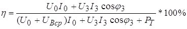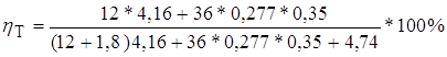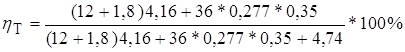 18. Площади поперечных сечений обмоточных проводов без изоляции для всех обмоток трансформатора рассчитываются по формулам: q1пр= I1/j; q1пр=3,35/4,6=0,7283 мм2 q2пр= I2/j; q2пр=4,6 /4,6= 1 мм2 q3пр= I3/j; q3пр=0,277/4,6=0,0602 мм2 19. Выбирается марка обмоточных проводов ПЭВТЛ-1 (tTmax до 1200) 20. Габариты провода: d 1пр=0,96 мм; q1пр=0,7238 мм2 ;d1из= 1,02 мм; d 2пр=1,16 мм; q2пр=1,057 мм2 ;d2из= 1,24 мм; d 3пр=0,27 мм; q3пр=0,05726 мм2 ;d3из= 0,31 мм; 21. Действующие значения плотности тока во всех обмотках трансформатора: j1=I1/ q1пр; j1=3,35/0,7238=4,63 A/мм2; j2=I2/ q1пр; j1=4,6 /1,057 =4,35 A/мм2; j3=I3/ q1пр; j1=0,277/0,05726 =4,84 A/мм2; 22. Удельные потери мощности в магнитопроводе трансформатора PСуд= PСудH (Bm/ВmH )2; PСуд=15,4 Вт/кг 23. Pc=PСуд *mc*10-3; Pc=15,4*135*10-3=2,08 Вт 24. Потери мощности в обмотках PM=ρ(0,9* j12* PM=0,0175(0,9* 4,63 2*57* 0,7238+1,1(4,35 2*0,135*36*1,057+ 4,84 2* 85*0,0602))* 10,4 (1+0,00411(120-20))*10-2=2,66 Вт 25. Суммарные потери мощности в трансформаторе PT=PC+PM; PT=2,08+2,66=4,74 Вт 26. КПД трансформатора