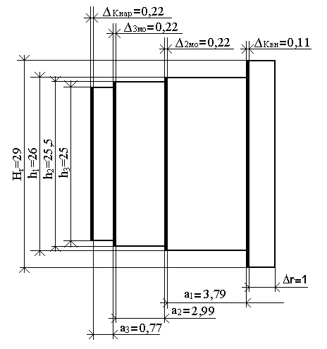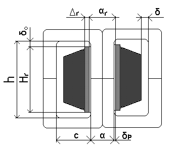 02. Ширина внутреннего прямоугольного отверстия изолирующей гильзы: αr =α+2δp, где δp величина радиального зазора между гильзой и несущим катушку стержнем магнитопровода. αr =12+2*1=14 мм 03. Толщина гильзы в радиальном направлении выбирается ∆r=1 мм 05. Габаритная высота гильзы Hr=h-2δ0, где δ0=0,5 мм величина осевого зазора между щечкой каркаса или торцевой поверхностью гильзы и ярмом магнитопровода. Hr=30-1=29 мм 06. Составляется план размещения обмоток в окне магнитопровода.