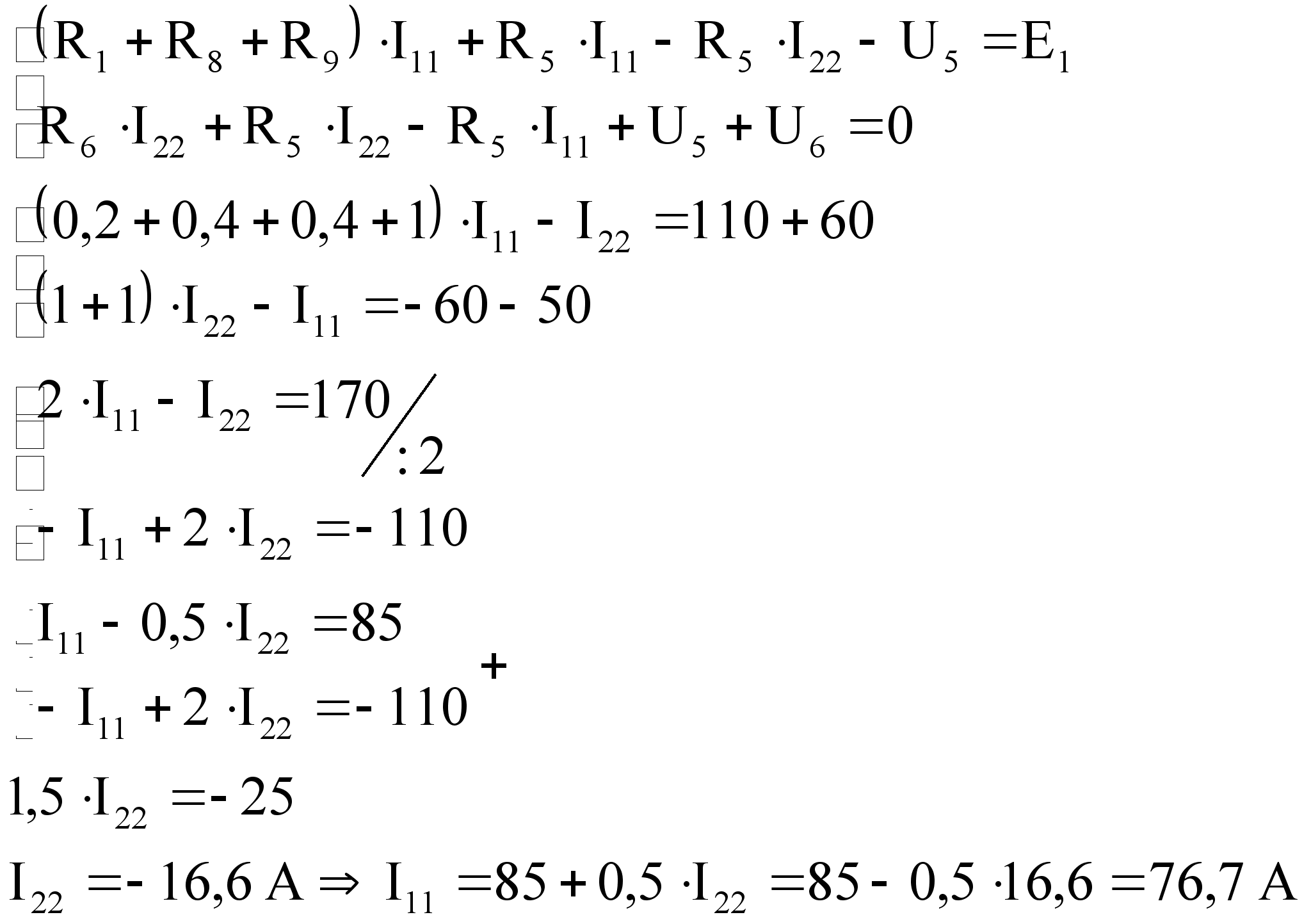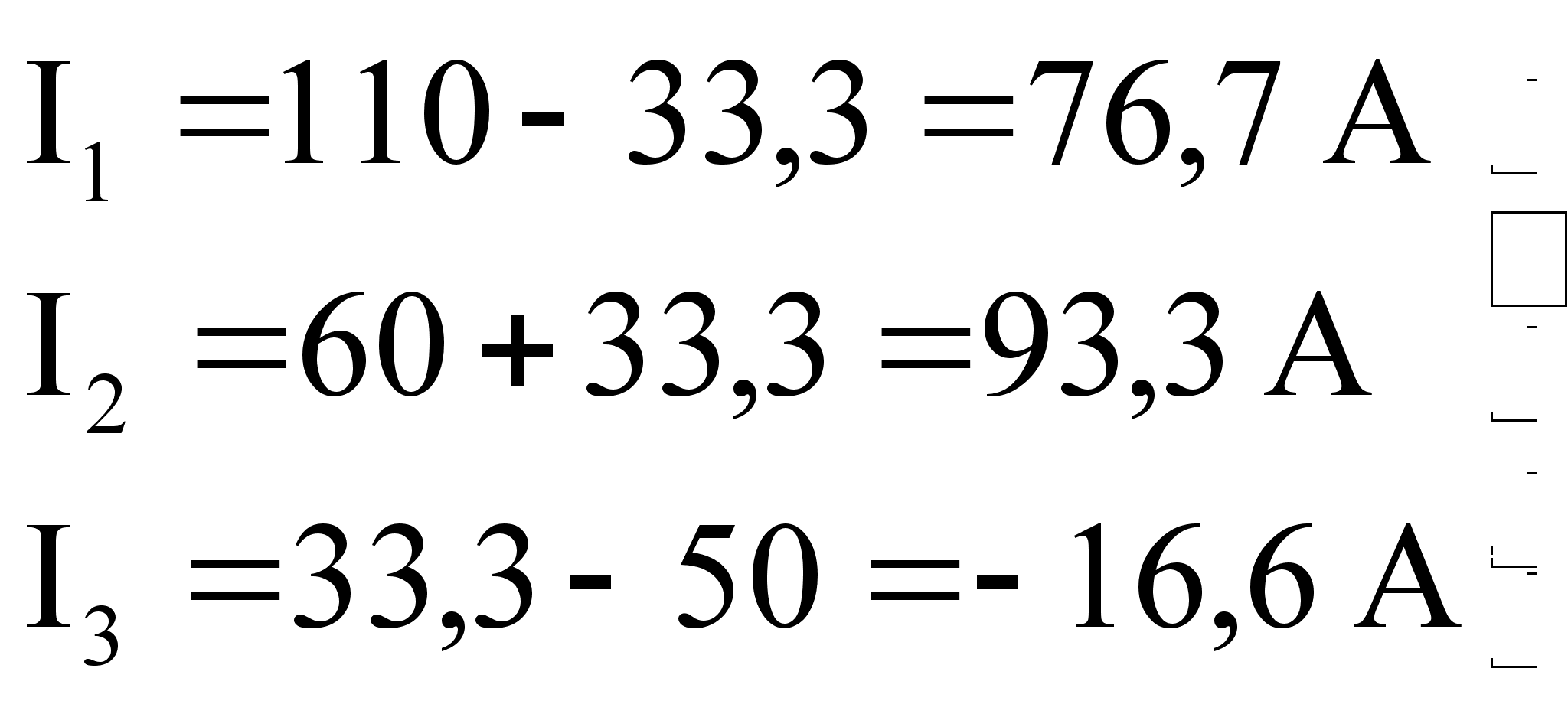 Токи во внешних ветвях равны контурным токам, значит: I1=I11=76,7 A – ток в первой ветви. I3=I22=-16,6 - ток в третей ветви. В смежной ветви ток равен разности контурных токов: I2=I22-I22=76,7+16,6=93,3 A – ток во второй ветви.