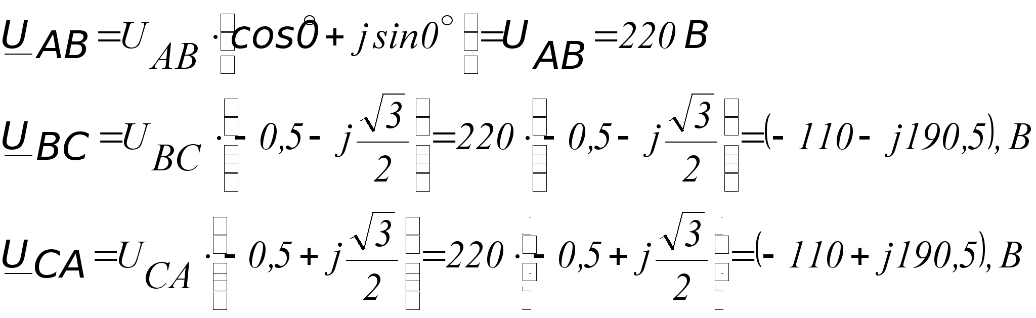 UAB=UBC=UCA=220 В Записать комплексы фазных напряжений