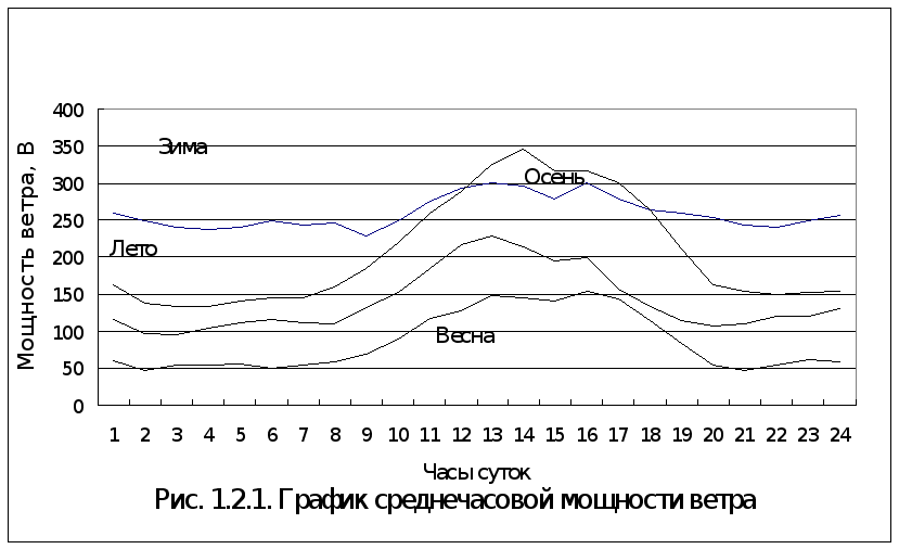 Из таблицы 1.2.1. видно, что наиболее вероятные скорости ветра равны 4 - 12 м/с. По данным таблицы 1.2.1. определена мощность ветра через единичную площадку Fо=1м, т.е. удельная мощность ветра, и построены графики (рис.1.2.1.).Удельная мощность, при этом, определялась с учетом вероятностного характера скорости ветра по формуле / 18,43/: