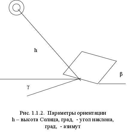 Функция космического солнечного излучения в силу своей строгой детерменированности хорошо изучена и затабулирована /37/. На рис. 1.1.1 приведен график функции Sг(T) - зависимость плотности мощности космического солнечного излучения от времени года для широты Ростовской области. Здесь же показан график суточной энергии космического солнечного излучения, построенный по данным /18/. Отметим, что мощность солнечного излучения, падающего на единичную площадку сориентированную каким-либо образом, зависит от ориентации этой площадки. Для ориентации единичной площадки введем следующие параметры (рис. 1.2): h - угол высоты Солнца над горизонтом; β - угол наклона площадки над горизонтом; γ - азимутальный угол, т.е. угол отклонения проекции нормали к площадке от направления на солнечный полдень.