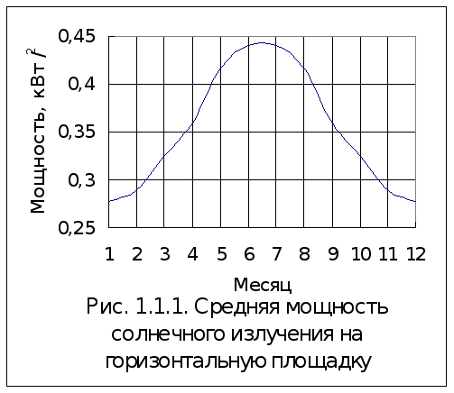 П Рис. 1.1.3. Пример распределения солнечногоизлучения в течение суток роанализируем, как можно использовать эти статистические данные для создания солнечных энергоустановок. Как уже отмечалось, для солнечных энергоустановок малой мощности наиболее эффективным является фиксированный солнечный коллектор, причем его ориентация определяется статистическим графиком солнечного излучения. Солнечное излучение зависит от времени суток и года, и прозрачности атмосферы, поэтому для ориентации солнечного коллектора необходимо иметь соответствующие среднестатистические данные. В таблице 1.1.1. приведены данные о статистическом распределении плотности солнечного излучения, которые могут быть использованы для определения положения коллектора. По данным таблицы 1.1.1. определяется сумма получаемой солнечной энергии за любой период года. Таким образом проведенный анализ показал, что солнечное излучение обладает большой энергией и существует достаточно статистических данных и математический аппарат для проектирования солнечных энергоустановок. Таблица 1.1.1. Удельная мощность солнечного излучения на горизонтальную поверхность