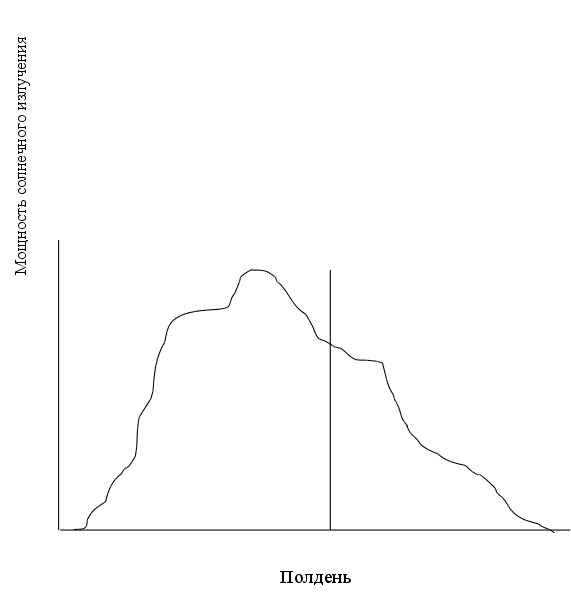 Согласно рис.1.1.2. наибольшая плотность мощности космического солнечного излучения будет при совпадении нормали к площадке и направления на Солнце. Так как положение Солнца относительно Земли непрерывно изменяется в течение года и суток, то для получения максимально возможной плотности мощности солнечного излучения углы b и g должны меняться соответствующим образом, т.е. необходимо непрерывное слежение за Солнцем. Однако, как показали многочисленные работы /18,24,27 /, при этом сильно увеличивается стоимость солнечной установки, превышая стоимость прибавки мощности от слежения. В этой связи, для маломощных солнечных установок наиболее эффективными являются фиксированные солнечные приемники (коллекторы) /18,27/. Следует отметить, что ориентация фиксированного солнечного коллектора не очевидна. Это объясняется следующими причинами : - плотность мощности солнечного излучения зависит от прозрачности атмосферы (см.(1.1.4.)) ; - график потребления мощности может быть сдвинут в течении суток. На рис.1.1.3. приведен пример плотности мощности солнечного излучения, реально падающего на солнечный коллектор. Здесь предполагается , что в утренние часы нет облачности , а в послеобеденные часы появляется облачность. Если такие условия являются статистически устойчивыми, то очевидно , что целесообразно ориентировать солнечный коллектор не строго на юг, а на юго-восток, причем более точное его положение должно определяться специальными оптимизационными расчетами . Таким образом, для ориентации солнечных коллекторов необходимы статистические данные о прозрачности атмосферы или о реальных суточных графиках поступающих через атмосферу потоков солнечной энергии. За солнечным излучением следят метеорологические станции в рамках государственных программ метеорологии, поэтому имеется достаточно статистических данных о графиках поступления солнечной энергии .