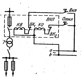 Дифференциальная защита (1РНТ, 2РНТ) (рис. 7,б) выполнена на реле РНТ-363 (с насыщающимися трансформаторами) и действует на промежуточные выходные реле 1РП и 2РП Рис. 7. Схема защиты трансформатора отпаечной подстанции, имеющего встроенные трансформаторы тока. (типа РП-341). Пуск реле РП-341 осуществляется замыкающими контактами реле 1РНТ, 2РНТ. Мощные контакты реле 1РП и 2РП, переключаясь, подключают трансформаторы тока к электромагнитам включения короткозамыкателя 1ЭВК, 2ЭВК. и электромагнитам отключения 1ЭО и 2ЭО выключателя стороны низшего напряжения трансформатора. При подключении электромагнитов возрастает нагрузка на питающие их трансформаторы тока. Для предотвращения возврата пускового реле из-за увеличения нагрузки в токовых цепях контакты реле 1РП и 2РП подключены параллельно контактам пусковых реле защиты. Таким образом, реле РП-341 самоудерживается за счет тока, проходящего по его обмотке, независимо от положения контактов пусковых реле. Чтобы обеспечить надежную работу электромагнита, его ток срабатывания должен быть не более 0,8 тока срабатывания действующей на него защиты. Поскольку чувствительность основных токовых защит должна быть не менее 1,5, то при минимальном токе к. з., при котором она обеспечивается, чувствительность электромагнита будет не менее 1,5/0,8 » 2. Соблюдение этого условия важно, потому что при малых токах, близких к току срабатывания, электромагнит работает замедленно и защита питающей линии может сработать раньше, чем сработает электромагнит короткозамыкателя. Это в свою очередь приведет к неуспешному АПВ выключателя линии. ОСОБЕННОСТИ АПВ ТРАНСФОРМАТОРОВ На однотрансформаторной подстанции АПВ трансформатора является обязательным. Осуществление на" двухтрансформаторной подстанции АПВ трансформаторов рекомендуется, если при отключении одного трансформатора оставшийся в работе трансформатор не может обеспечить питание нагрузки без отключения части, потребителей. Запрет АПВ. при повреждении внутри бака трансформатора осуществляется с помощью сигнального контакта газового реле. Для осуществления АПВ трансформатора используются те же устройства, что и для АПВ линии. При этом АПВ должно действовать с выдержкой времени для исключения его срабатывания при внутренних к. з., сопровождающихся бурным газообразованием, когда отключающий контакт газового реле замыкается раньше, чем сигнальный. АВТОМАТИЧЕСКОЕ ВКЛЮЧЕНИЕ РЕЗЕРВНОГО ИСТОЧНИКА ПИТАНИЯ ПРИ ОТКЛЮЧЕНИИ ТРАНСФОРМАТОРА На подстанциях широкое распространение получили устройства автоматического включения секционного выключателя С В при исчезновении питания на одной из секций шин низшего напряжения. Схема АВР СВ, выполненная с помощью реле РПВ-358, представлена на рис. 8. Пуск АВР осуществляется при соблюдении следующих условий: несоответствие положения ключа управления (фиксируемого с помощью реле 1РПФ, обмотки которого не показаны