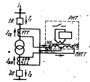 если Iс,з отнесен к стороне Y трансформатора, где вторичные обмотки 1ТТ соединены в треугольник. Дифференциальная отсечка считается приемлемой, если при двухфазном к. з. на выводах низшего напряжения трансформатора kч >= 2. Несмотря на низкую чувствительность дифференциальной отсечки ее достоинство заключается в обеспечении быстроты срабатывания при наибольших кратностях тока к. з. При использовании реле с насыщающимися промежуточными трансформаторами РНТ выбор тока срабатывания защиты Iс,з производится по выражениям; Iс,з = (1 ¸ 1,3I)т,ном (7) Iс,з = kотс(I’нб + I”нб) (8) В (8) неучет I”нб объясняется возможностью скомпенсировать эту составляющую (в первом приближении) с помощью промежуточного насыщающегося трансформатора тока ПНТТ с несколькими первичными обмотками (рис. 5,5), когда для предотвращения попадания в реле защиты тока небаланса, обусловленного неравенством токов I’11в и I’1в в цепи циркуляции, производится выравнивание м. д. с. первичных обмоток w1, w2 промежуточных трансформаторов тока так, что I’1в w1 » I’11в w2, т. е. Eв,т » 0 и Iр » 0. Кроме того, в (8) при расчете I’нб значение коэффициента kапер принимается равным единице.