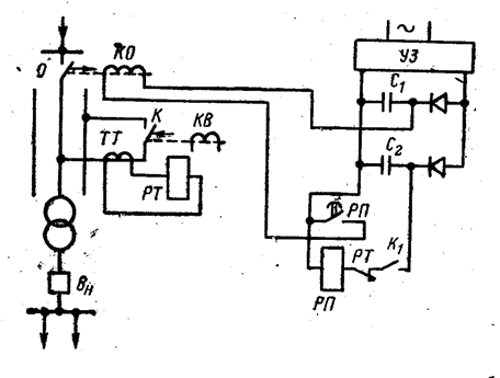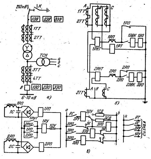 Рис. 6. Схема отключения отделителя с. применением батарей предварительно заряженных конденсаторов. венным надежным источником оперативного тока в данном случае могут быть батареи предварительно заряженных конденсаторов. 2. Для включения короткозамыкателя на стороне высшего напряжения трансформатора (и для отключения выключателя на стороне низшего напряжения) часто используют энергию предварительно заряженных конденсаторов при невозможности использования схем с дешунтированием электромагнитов включения короткозамыкателя и отключения выключателя (когда вторичные токи к. з. составляют более 150 А). Такие случаи характерны для трансформаторов 110 кВ малой мощности (2,5; 4; 6,3 МВ*А) при использовании встроенных во вводы трансформатора трансформаторов тока (типа ТВТ-110). Вместе с тем зарядные устройства, включаемые на ТСН или ТН, не могут обеспечить заряд разряженных конденсаторов при включении трансформатора на трехфазное к. з. на его выводах или на шинах НН подстанции. Поэтому заряд конденсаторов в этих случаях обеспечивается применением специального зарядного устройства, питающегося как от цепей напряжения, так и от цепей тока. 3. Вследствие кратковременности разряда конденсатора серьезные требования предъявляются к качеству наладки и состоянию аппаратуры (короткозамыкателей и отделителей). Загрязнения, окисление, загустение смазки могут привести к недолустимому замедлению действия этих аппаратов. Применение подстанций с короткозамыкателями на 'стороне высшего напряжения характеризуется увеличением времени отключения поврежденного участка из-за сравнительно большого собственного времени включения короткозамыкателей. Этот недостаток можно исключить, если вместо короткозамыкателей использовать телеотключение. При передаче команды телеотключения лр кабелю предусматривается постоянный контроль состояния его жил с помощью специального устройства (например, .типа УК-1) В эксплуатации применяется также передача отклю-,.4 чающего импульса по в. ч. каналу, организованному по проводам линии электропередачи с помощью специальной аппаратуры в. ч. обработки и специальных устройств высокочастотного телеотключения (ВЧТО). При повреждении трансформатора и срабатывании его защиты одновременно с отключением выключателя и запретом его АПВ подается по линиям сигнал телеотключения (ТО) к передатчику. Сигнал по каналу связи подается на входы приемников питающих подстанций, вызывая срабатывание на них промежуточных реле, отключающих головные выключатели. С целью повышения надежности при осуществлении устройства телеотключения сохраняется и короткозамыкатель. СХЕМА ЗАЩИТЫ ТРАНСФОРМАТОРА НА ПЕРЕМЕННОМ ОПЕРАТИВНОМ ТОКЕ На рис. 7 представлена схема защиты трансформатора отпаечной подстанции. Оба контакта газовой защиты (как сигнальный, так и отключающий) питаются от трансформатора собственных нужд ТСН (рис. 7, а). Это допустимо, поскольку имеется дифференциальная защита, которая, являясь основной, резервирует действие газовой защиты в случае отказа последней при повреждениях трансформатора, сопровождающихся значительным снижением напряжения на шинах собственных нужд. Резистор 2СД (рис. 7, в), подключенный параллельно обмотке реле; ЗРП (типа РП-26), "увеличивает ток в обмотке указательного реле 2РУ (типа РУ-21) для обеспечени