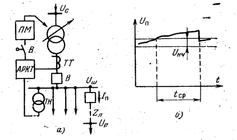 Рис. 9. Поясняющая схема (а) и характеристика изменения напряжения у потребителя при наличии АРКТ (б). ента трансформации трансформаторов понижающих подстанций, питающих распределительную сеть. Для изменения коэффициента трансформации под нагрузкой трансформаторы оборудуются устройствами РПН (переключение отпаек под нагрузкой). Автоматическое изменение nт осуществляется специальным регулятором АРКТ, воздействующим на РПН. В общем случае электрическая сеть, получающая питание от шин подстанции, может быть разветвленной и питать значительное количество нагрузок. При этом наиболее выгодно поддерживать неизменным напряжение в некоторой контролируемой точке, представив разветвленную сеть в виде эквивалентной линий с одной нагрузкой на конце. Поскольку значение напряжения Uп при данном напряжений на шинах Uш зависит от падения напряжения в эквивалентной линии (Uп = Uш – Zэ,лIп ) , то напряжение Uш должно быть тем больше, чем больше нагрузка потребителя. Такое регулирование напряжения получило названий встречного регулирования. Неизменность напряжения в контролируемой точке сети при различных режимах нагрузки может быть обеспечена, если смоделировать на входе измерительного органа АРКТ напряжения, существующие в регулируемой цепи. Для этого к нему необходимо подвести напряжение Uп = Uш – sIп Измерительный орган АРКТ является регулятором по отклонению напряжения от заданного значения UКОНТР, пропорционального напряжению в контролируемой точке. Если sIп будет равно падению напряжения в эквивалентной линии Zэ,л (от шин подстанции до контролируемой точки), т, е. sIп = Zэ,лIп, то при наличии АРКТ напряжение у потребителя (в контролируемой точке) будет соответствовать заданному значению. Из сказанного следует необходимость ввести в измерительный орган напряжения АРКТ сигнал, пропорциональный току нагрузки. Целесообразно использовать суммарный ток нагрузки, поскольку при различных графиках изменения нагрузок потребителей регулирование по суммарному току более точно отвечает необходимому закону регулирования. Измерительный орган подключается к трансформатору напряжения ТН и трансформаторам тока ТТ (рис. 9, а). При отключении выключателя В (рис. 9, а) АРКТ необходимо вывести из работы, что производится вспомогательным контактом В путем отсоединения выхода АРКТ от приводного механизма ПМ устройства РПН. * На двухтрансформаторных подстанциях, работающих с отключенным СВ, АРКТ устанавливается на каждом трансформаторе. При отключении одного из трансформаторов и включении секционного . выключателя следует убедиться (у АРКТ остающегося в работе трансформатора) в правильности поддержания напряжения при встречном регулировании и при необходимости изменить значение s. Особенностями АРКТ являются релейность действия, наличие зоны нечувствительности Uнч выбираемой большей, чем ступень изменения напряжения DUст при переключении одной отпайки: Uнч = (1.25¸1.3) DUст Переключение отпаек необходимо производить с выдержкой времени, обеспечивающей отстройку от кратковременных колебаний напряжения (например, при пуске электродвигателей). Поэтом при выходе напряжения у потребителя из зоны нечувствительности регулятора (рис. 9, б) АРКТ через время tср = 1¸2 мин воздействует на РПН. СПИСОК ЛИТЕРАТУРЫ 1. Кривенко В.В., Новелла В.Н. «Релейная защита и 