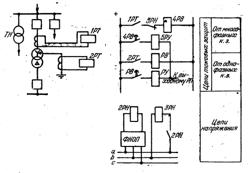 Рис. 2. Защита трансформатора от внешних к. з. и перегрузок. Напряжение срабатывания 2РН отстраивается от напряжения небаланса Uнб, раб на выходе фильтра ФНОП в рабочем режиме: