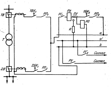 где kотс = 1,05 — коэффициент, учитывающий погрешность в значении тока срабатывания. На трехобмоточных трансформаторах с односторонним "питанием защита от перегрузки устанавливается со стороны питания. При существенно различных мощностях обмоток устанавливается дополнительно защита на питаемой обмотке меньшей мощности. ГАЗОВАЯ ЗАЩИТА ТРАНСФОРМАТОРА Обмотки большинства трансформаторов помещены в бак, залитый маслом, которое используется как для изоляции обмоток, так и для их охлаждения. При возникновении внутри бака электрической дуги к. з., а также при перегреве обмоток масло разлагается, что сопровождается выделением газа. Это явление и используется для создания газовой защиты. Защита выполняется с помощью газового реле, установленного в трубе, соединяющей бак трансформатора с расширителем. Газовое реле состоит из кожуха и двух расположенных внутри него поплавков, снабженных ртутными контактами, замыкающимися при изменении их положения. Оба поплавка шарнирно укреплены на вертикальной стойке. Один из них расположен в верхней части, а второй — в центральной. При слабом газообразовании (газ скапливается в верхней частей кожуха реле), а также при понижении уровня масла верхний поплавок опускается, что приводит к замыканию его контактов. При бурном газообразовании потоки масла устремляются в расширитель, что приводит к замыканию контактов обоих поплавков. .Контакты верхнего поплавка носят название сигнальных, а нижнего — основных контактов газового реле. Движение масла через газовое реле, вызванное к. з. внутри бака трансформатора, обычно является толчкообразным: Поэтому замыкание основных контактов может быть ненадежным (перемежающимся), что учитывается, при выполнении схемы газовой защиты трансформатора. На рис. 3 изображена схема газовой защиты на переменном оперативном токе. Выходное промежуточное реле защиты РП самоудерживается до отключения выключателя 1В со стороны питания. Поскольку газовая защита может сработать ложно, например, вследствие выхода воздуха из бака трансформатора после доливки свежего масла, в схеме защиты предусмотрены переключающее устройство ПУ и резистор R, с помощыо которых действие газовой защиты может быть переведено на сигнал. Достоинствами газовой защиты являются простота выполнения, срабатывание при всех видах повреждения внутри бака трансформатора, высокая чувствительность.