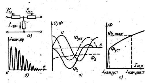 Рис. 4. Изменение потока и тока намагничивания при включении трансформатора под напряжение. а — поясняющая схема; б —изменение тока намагничивания; в — изменения напряжения и магнитного потока; г — характеристика намагничивания. Значение тока при броске зависит от момента включения трансформатора под напряжение. Наибольшее значение бросок тока намагничивания имеет при включении трансформатора в момент, когда мгновенное значение напряжения U равно нулю (рис. 4, в, г). В этом случае магнитный поток Фt в сердечнике трансформатора в начальный период времени содержит большую апериодическую составляющую Фa и превышает при переходном процессе установившееся значение Фуст практически в 2 раза. Поскольку зависимость Ф = f(Iнам) нелинейна, то iнам увеличивается по отношению к установившемуся значению в сотни раз, но остается обычно меньшим максимальных переходных токов внешних (сквозных) к. з. Бросок тока намагничивания может содержать большую апериодическую слагающую, а также значительный процент высших гармоник (прежде всего второй). Затухание броска происходит медленнее, чем тока к. з. В результате кривая броска тока намагничивания iнам,бр (рис. 4, б) может оказаться смещенной по одну сторону оси времени. Указанные характерные особенности броска тока намагничивания используются для обеспечения отстроенности дифференциальной токовой защиты трансформатора, поскольку при отстройке защиты по току срабатывания она имеет очень низкую защитоспособность, а при отстройке по времени — теряет быстроту срабатывания. Схемы соединения обмоток трансформатора. Если обмотки высшего и низшего напряжения трансформатора соединены не по схеме Y/Y -12, а по какой-то другой схеме, то между токами фаз трансформатора на сторонах высшего и низшего напряжения существует фазовый сдвиг. Так, при широко распространенной схеме соединения обмоток трансформатораY/D-11 фазовый сдвиг составляет ÐI1пI11п = 30 эл. град. Поэтому при одинаковых схемах соединения вторичных обмоток групп 1ТТ и 2ТТ трансформаторов тока (на сторонах высшего и низшего напряжения) в дифференциальной цепи защиты при внешнем к. з, проходит значительный ток, равный примерно половине вторичного тока ТТ при внешнем к. з. • Поэтому схемы соединения групп 1ТТ и 2ТТ должны быть такими, чтобы указанный сдвиг по фазе отеутствовал (ÐI1пI11п = 0). При этом возможны два варианта: вторичные обмотки группы 1ТТ соединяются в треугольник, а группы 2ТТ — в звезду или вторичные обмотки группы 2ТТ — в треугольник, а 1ТТ — в звезду. Схема соединения обмоток ТТ в первом случае ясна из рис. 5. Предпочтение всегда отдается первому варианту, так как соединение в треугольник вторичных обмоток ТТ, установленных со стороны звезды силового трансформатора, предотвращает возможное неправильное срабатывание дифференциальной защиты при внешних однофазных к. з. (когда нейтраль трансформатора заземлена), поскольку соединение в треугольник предотвращает попадание токов нулевой последовательности в реле защиты. При соединении вторичных обмоток 1ТТ в треугольник токи в цепи циркуляции от 1ТТ (I’1в) в ÖЗ раз больше вторичных токов 1ТТ (I1в). Поэтому коэффициент трансформации 1ТТ выбирается равным IтYном ÖЗ/5, где IтYном — номинальный ток трансформатора со стороны обмотки силового трансформатора, соединенной в звезду.