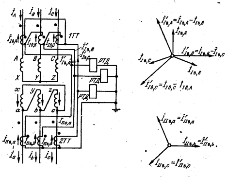 Рис. 5. Схема соединения ТТ дифференциальной токовой защиты трансформатора Y/D-11 и векторные диаграммы. Несоответствие коэффициентов трансформации ТТ расчетным значениям. Для обеспечения равенства токов в цепи циркуляции должно соблюдаться соотношение