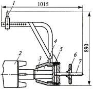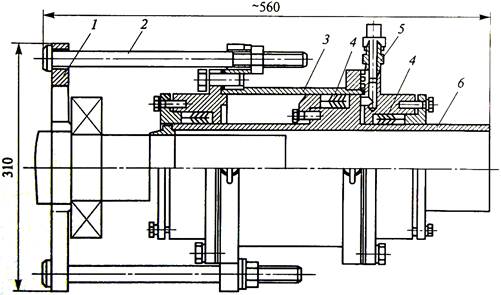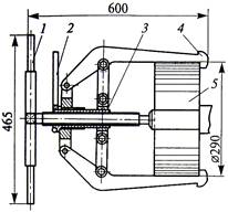 Рис. 3.5. Гидравлический подвесной съемник для снятия подшипников с валов двигателей с высотой оси вращения 180...280 мм (6...9-го габаритов): 1 — скоба; 2 — тяга; 3 — цилиндр; 4 — уплотнения; J — штуцер; 6 — поршень