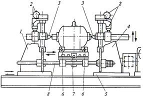 Рис. 3.4. Снятие подшипников с использованием вставок (а) и хомута (б): 1 — внутренняя крышка подшипника; 2 — прокладки; 3 — хомут пользуют специальный стенд для разборки двигателей (рис. 3.6). Перед установкой на стенд с двигателя снимают кожух вентилятора, вентилятор и болты, крепящие крышки подшипников, и подшипниковые щиты. Двигатель устанавливают на стенде рабочим концом вала к подвижной стойке 1 и закрепляют с помощью зажимов 6. С помощью электропривода 2 устанавливают пиноли-3 по высоте оси вращения двигателя и, перемещая стойку 1 вправо, фиксируют двигатель в пинолях (правая стойка 4 неподвижна). Включают движение стола 7 влево по направляющим 8, при котором левый подшипниковый щит выпрессовывается с наруж ного кольца подшипника, а правый — из замка на корпусе. Между правым подшипником и корпусом двигателя устанавливают опорную вилку (не показана) и включают движение стола вправо. При этом левый подшипниковый щит выпрессовывается из замка на корпусе, а правый подшипник — с вала. Устанавливают опорную вилку между левым подшипником и корпусом двигателя и включают движение стола 7 влево, производя выпрессовку левого подшипника с вала. Затем выводят пиноли 3 из центров вала, поворачивают стол 5 с двигателем на угол 60...90° и снимают с вала крышки подшипников, подшипниковые щиты и подшипники.