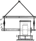 Рис. 3.6. Стенд для разборки электродвигателя: 1 — подвижная стойка; 2— электропривод; 3— пиноли; 4— неподвижная стойка 5— поворотный стол; 6 — зажимы; 7— стол; 8 — направляющие Одним из указанных выше способов выводят ротор из статора, ослабляют зажимы 6 и снимают корпус (статор) двигателя со стенда. На все детали и узлы навешивают бирки с одним ремонтным номером двигателя и направляют статор на участок удаления (извлечения) обмотки, а остальные узлы и детали — на мойку. Если ротор имеет фазную (не короткозамкнутую) обмотку, то его направляют вместе со статором на участок удаления обмотки. Технология разборки любой крупной электрической машины с подшипниками скольжения имеет свои специфические особенности, связанные с ее конструкцией, местом установки, наличием грузоподъемных механизмов и др. Поэтому приведем только общие операции по разборке крупных машин. При разборке измеряют: воздушный зазор между ротором и статором в четырех точках (через 90°) с обеих сторон; радиальные зазоры в подшипниках и натяги крышек подшипников на вкладыши, радиальные зазоры между радиатором и диффузором; зазоры по уплотнениям вала и по маслоуловителям; совпадение магнитных осей статора и ротора; осевой разбег ротора и уклон вала ротора. Результаты измерений заносят в формуляр, проводят предре-монтные испытания и приступают к разборке машины. Снимают наружные и внутренние щиты и диффузоры, в воздушный зазор под ротор заводят лист электрокартона и после разборки опорных подшипников опускают ротор на статор. После этого снимают полумуфты или шестерни, подогревая их при необходимости, зачищают посадочные поверхности и определяют натяг. Чтобы не повредить обмотки статора при выводе ротора, их закрывают листами из прессшпана или резины. Ротор извлекают с помощью грузоподъемных механизмов и специальных скоб (для роторов массой до 500 кг), пригодных для роторов машин до 19 габарита включительно. Для выведения ротора на кран подвешивают траверсу 4 (рис. 3.7) с двумя регулировочными болтами 3. На вал надевают удлинитель 2. Вывесив ротор с помощью крана и регулировочных болтов 3, выводят его из статора (вправо) и опускают на предварительно установленную рядом со статором подставку (не показана). Затем снимают удлинитель, переносят левый строп на левый конец вала, вывешивают ротор и перемещают его на место ремонта или для дальнейшего транспортирования. Статор остается на своей фундаментной плите 1.