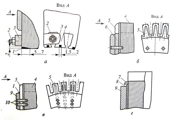 Рис. 4.1. Ремонт сердечников: а — с использованием сварки: б — с использованием дополнительных нажимных шайб с зубцами; в — с использованием отдельных нажимных пальцев; г — с использованием клиньев; 1 — сварной шов; 2— шпилька; 3— кольцо (сегмент); 4 - зубцы сердечника; 5 — нажимные пальцы; 6 — дополнительная шай-ба; 7 - крайний лист сердечника; 8 — текстолитовый клин; 9 — нажимная шайба; 10 — штифты При ослаблении прессовки сердечников крупных электрических машин, у которых прессовка осуществляется стяжными шпильками, производят подтяжку шпилек. Для этого удаляют сварные швы, стопорящие гайки стяжных шпилек от самоотвинчивания, подтягивают четыре гайки, расположенные в диаметрально противоположных точках, и производят обтяжку нажимного фланца, завертывая остальные гайки в несколько обходов. По окончании подтяжки восстанавливают сварные швы. Если гайки не удается подтянуть или подтяжкой не удается восстановить прессовку сердечника, прессовку восстанавливают забивкой в зубцовую зону клиньев из стеклотекстолита марки СТЭФ-1. Поверхности для забивки клиньев обезжиривают бензином Б-70 и подсушивают, контактные поверхности сегментов и клиньев промазывают лаком БТ-99 или эпоксидным клеящим лаком ЭЛ-4. После установки клиньев для полной полимеризации проводят сушку при температуре 20...25°С в течение 10...12ч. 4.4. Ремонт при нарушении межлистовой изоляции. Если имеется нарушение на небольшую глубину лакового покрытия отдельных сегментов, прилегающих к месту установки клиньев, то перед забивкой клина между сегментами вставляют прокладки из слюды на лаке БТ-99 на глубину 20... 35 мм. Местные нарушения межлистовой изоляции на поверхности статора устраняют путем установки лепестков слюды между сегментами или изолировкой сегментов жидким лаком БТ-99. Для этого сегменты разводят специально заточенными узкими и тонкими стальными полосами необходимой длины. Большие площади повреждений устраняют травлением в концентрированной азотной кислоте. На статор наматывают намагничивающую и контрольную обмотки и, пропуская по намагничивающей обмотке ток, определяют место повышенного нагрева, что свидетельствует о повреждении изоляции. Поверхность, окружающую место повреждения, защищают шпаклевкой и химически стойкой эмалью, нагревают поврежденную зону до 75... 105 °С с помощью намагничивающей обмотки и, отключив ток, протравливают поврежденное место концентрированной азотной кислотой. После окончания травления остатки кислоты нейтрализуют 4...5-кратной обработкой салфетками, смоченными 10 % раствором кальцинированной соды, и промывают ремонтируемое место горячей дистиллированной водой температурой 40... 60 °С. Затем протирают его салфетками и промывают спиртом. 4.5. Ремонт при выгорании участка зубца сердечника. При выгорании или оплавлении участка зубца 2 сердечника удаляют дефектную часть и устанавливают на ее место «протез» 1 из стеклотекстолита для предотвращения выпучивания обмотки (рис. 4.2). Удаление поврежденной области производят с помощью острого зубила с его возможным предварительным высверливанием, после чего устраняют замыкания листов. «Протез» изготавливается по месту и устанавливается на клее ЭЛ-4.