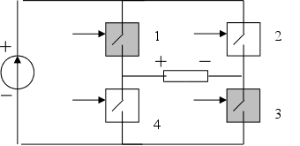 Работа заключается в парной работе диодов (ключей), каждый раз включается диагональная пара диодов (ключей) и в зависимости от полярности сигнала формируется либо положптельный либо отрицательный импульсы (выходное напряжение инвертора всегда импульсное)