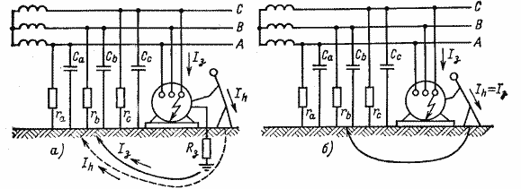 Рис. 2. Прикосновение к корпусу, оказавшемуся под напряжением: а – при исправном заземлении; б – при отсутствии заземления Величина напряжения прикосновения для человека, стоящего на грунте и коснувшегося оказавшегося под напряжением заземленного корпуса, может быть определена как разность потенциалов руки (корпуса) и ноги (грунта) с учетом коэффициентов: 1 - учитывающего форму заземлителя и расстояния от него до точки, на которой стоит человек; 2 - учитывающего дополнительное сопротивление в цепи человека (одежда, обувь) Uпр = U3 1 2, а ток, проходящий через человека Ih = (I3*R3* 1 2)/Rh Наиболее опасным для человека является прикосновение к корпусу, находящемуся под напряжением и расположенному вне поля растекания (рис. 3).