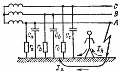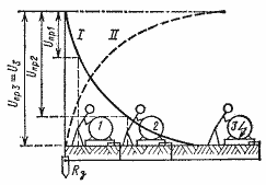 Рис. 3. Напряжение прикосновения к заземленным нетоковедущим частям, оказавшимся под напряжением:: I – кривая распределения потенциалов; II - кривая распределения напряжения прикосновения Напряжением шага (шаговым напряжением) называется напряжение между двумя точками цепи тока, находящихся одна от другой на расстоянии шага, на которых одновременно стоит человек (ГОСТ 12.1.009). Uш = U3 1 2, Ih = I3*(R3/Rr1 2, где 1 - коэффициент, учитывающий форму заземлителя; 2- коэффициент, учитывающий дополнительное сопротивление в цепи человека (обувь, одежда). Таким образом, если человек находится на грунте вблизи заземлителя, с которого стекает ток, то часть тока может ответвляться и проходить через ноги человека по нижней петле (рис. 4).