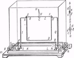 Рис Б. Рамка с током (слева) и соленоид с током (справа) В опытах Ампера Свои первые сообщения о результатах опытов Ампер сделал на заседаниях Пapижcкoй академии наук осенью 1820 г. Пocлe этого он занялся разработкой теории взaимoдейcтвия проводников, по которым течет электрический ток. Ампер решил в основу теории взаимодействия токов положить закон взaимoдейcтвия между элементaми токов. Нужно отметить, что Ампер говорил уже не просто о взаимодействии элементов проводников, как Био и Савар, а о взаимодействии элементов токов, так как к тому времени уже возникло понятие силы тока. И это понятие ввел сам Aмпep. следуя взглядам того времени о подобии элементарных сил силам тяготения, Ампер пpeдпoлoжил, что сила взаимодействия между элементами двух токов будет зависеть от расстояния между ними и должна быть направлена по прямой, соединяющей эти два элемента. проведя большое число опытов по определению взаимодействия токов в проводниках различной формы и пo-paзнoмy расположенных друг относительно друга, Aмпep в конце концов определил искомую силу. подобно силе тяготения она оказалась обратно пропорциональной квадрату расстояния между элeментaми электрических токов. В отличие от силы тяготения ее значение зависело еще и от относительной ориентации элементов токов. формулу, которую получил Ампер, мы приводить не будем. она оказалась неверной, потому что он заранее предположил, что сила взauмoдейcтвия между элементами токов должна быть направлена по прямой, соединяющей эти элементы. Ha самом же деле эта сила направлена под углом к этой прямой. однако вследствие того что Aмпep проводил опыты с замкнутыми постоянными токами, он получал при расчетах по своей формуле правильные результаты. Оказывается, что для замкнутых проводников формула Ампера приводит к тем же результатам, что и исправленная впоследствии формула, выражающая силу взаимодействия между элементами токов, которая по-npежнeмy носит название закона Ампера. Огромную роль в науке об электричестве сыграл созданный У. Стердженом в 1825 г. первый электромагнит. Его устройство было простым. Он представлял собой стержень из мягкого железа, покрытого для изоляции лаком, на который была намотана проволока. По сравнению с распространенными тогда постоянными магнитами этот электромагнит обладал значительными преимуществами, так как давал более сильный эффект. Новый этап в развитии электротехники неразрывно был связан с именем М. Фарадея. Электрический ток вызывал магнитные действия, и вполне естественно было предположить, что и магнитные явления могут вызвать появление электрического тока. В 1831 г. в результате многолетних опытов М. Фарадею удалось осуществить «превращение магнетизма в электричество». Так было сделано одно из великих открытий XIX в. открытие электромагнитной индукции, оказавшее огромное воздействие на все последующее развитие электротехники. Опытами Фарадея было установлено, что электромагнитная индукция возникает как в неподвижном проводнике, находящемся в изменяющемся магнитном поле, так и в проводнике, который перемещается в неизменном магнитном поле. Введя понятие о магнитных силовых линиях, образующих магнитное поле, ученый доказал, что наведение тока в проводнике будет происходить только тогда, когда изменяется магнитный поток через контур. Открытие электромагнит