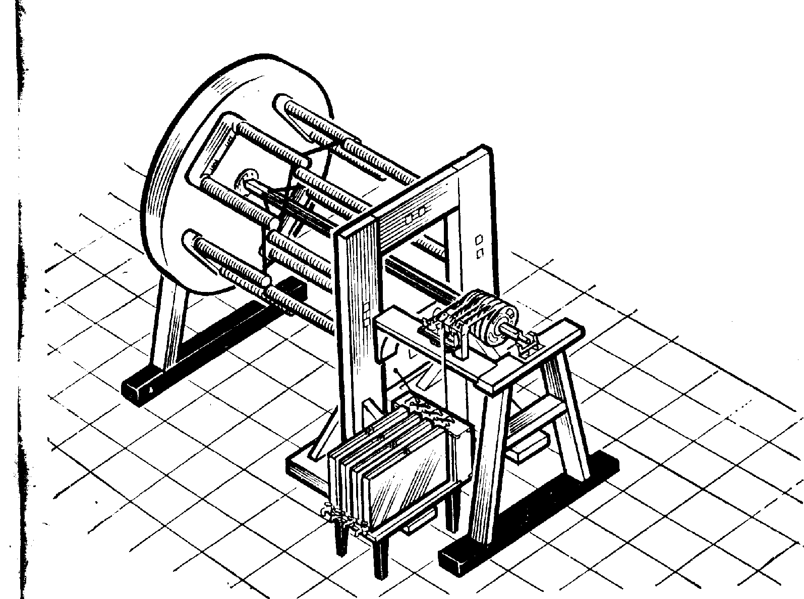 Рис. 5. Судовой электродвигатель Б. С. Якоби конструкции 1838 г. В гальванических элементах были установлены электроды со значительно большей поверхностью, что дало возможность сократить их число и тем самым уменьшить площадь всей батареи. В электродвигателе был заменен коммутатор, а также изоляция проводников. По своему устройству двигатель 1839 г. почти ничем не отличался от двигателя 1838 г. И тот и другой были одной и той же модели (рис. 5). Однако внесенные усовершенствования существенно повысили его мощность, которая увеличилась в 3-4 раза по сравнению с двигателями 1838 г. Испытания катера с усовершенствованным двигателем, «лучшим, чем все доселе изготовленные для опыта одели», началось на Неве 8 августа 1839 г. в присутствии многих высокопоставленных должностных лиц. Они продолжались и в сентябре 1839 г. На электроходе плавало от 10 до 14 человек. Более мощный двигатель быстрее вращал гребные колеса и тем самым обеспечивал большую скорость катера . Его скорость превышала вдвое скорость, достигнутую в 1838 г., и составляла 4 км/ч. Результаты испытаний превосходили все то, что было достигнуто за рубежом, где многие ученые, «поддерживаемые значительными денежными пожертвованиями и обширными техническими средствами», также проводили работы, связанные с практическим применением электродвигателя. Это значительное событие в технике того времени стало известно всему миру. Оно широко освещалось в мировой печати и повсеместно вселяло надежду, что проблема использования электродвигателя в судоходстве будет успешно решена в ближайшее время. «Я душевнейшим образом желаю писал М. Фарадей Якоби чтобы Ваши большие труды получили высокую награду, которую они заслуживают». Ему уже казалось возможным надеяться на применение электродвигателей на крупнейших в то время судах, связывающих Англию с Америкой и Ост-Индией. Свое письмо Фарадей заканчивает восклицанием: «Какое это было бы славное дело!» Газета «Северная пчела», издававшаяся в Петербурге, писала 27 сентября 1839 г.: «В средние века фанатики сожгли бы г. Якоби, а поэты и сказочники выдумали о нем легенду, как о Фаусте. В наше время мы не сожжем его, а согреем чувством признательности за его полезные труды и вместо легенды скажем правду, а именно, что г. Якоби, сверх учености, отличный человек во всех отношениях и что наука вправе от него надеяться на многое, потому что в нем нет педантства, а (есть) истинная пламенная страсть к наукам и столь же пламенное желание быть полезным гостеприимной и благодарной России. В 1840 г. Якоби выступил с докладом об итогах испытания на съезде Британской ассоциации естествоиспытателей, где присутствовали ученые всего мира, работавшие над важнейшими научными проблемами. Однако ничего нового и полезного для себя по вопросам практического применения электродвигателя он за границей не нашел. В письме к жене в Петербург он писал: «Когда увидишь Ленца, много раз поклонись ему от меня и сообщи следующее. Пока я еще не видел и не слышал ничего нового и думаю, что мы и в теоретическом и практическом отношении еще стоим на шаг впереди. Говоря без лишней гордости, нам приходится скорее учить, чем учиться. Мы оба здесь в большом почете, наши работы распространяются здесь в оттисках». Вернувшись в Петербург, Якоби, убежденный в важности начатого им дела, прилагает максимум усилий, ч