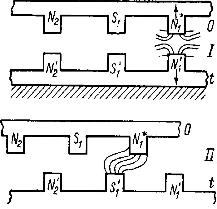 Перед запуском двигателя одноименные полюсы устанавливаются друг против друга . После начального толчка при включении батареи электромагнит N 1 будет отталкиваться от одноименного полюса N’1 и притягиваться полюсом S‘1 В результате такого взаимодействия полюс электромагнита N1 станет против полюса электромагнита S’1 и по инерции пройдет несколько дальше. В этот момент коммутатор (действие его будет рассмотрено позднее) произведет переключение полюсов батареи, и по обмотке электромагнитов подвижного диска будет проходить ток обратного направления. Вследствие этого полярность полюсов электромагнитов подвижного диска изменится и полюс N1, ставший теперь полюсом, одноименным с полюсом S’1 , будет от него отталкиваться. Аналогичный процесс будет происходить и при взаимодействии остальных полюсов электромагнитов, расположенных на подвижном диске и на неподвижной раме. Такое периодическое изменение полюсов электромагнитов в подвижном диске 8 раз за один оборот при наличии инерции будет поддерживать непрерывное вращение как подвижного диска, так и вмонтированного в его центр рабочего вала электродвигателя. Талантливый инженер так остроумно решил вопрос о вращательном движении рабочего вала. Якоби первым в науке об электричестве обосновал все важнейшие преимущества такого движения для всех электродвигателей и убедительно показал нецелесообразность использования в них возвратно-поступательного движения. История полностью подтвердила исключительную плодотворность этой идеи. Все электрические машины со времени Якоби стали строиться с вращательным движением якоря двигателя.