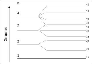 На рис. 3 изображено относительное расположение энергетических уровней и подуровней. Следует учесть, что 4s-подуровень расположен ниже 3d-подуровня. Распределение электронов в атомах по энергетическим уровням и подуровням изображают с помощью электронных формул, например: