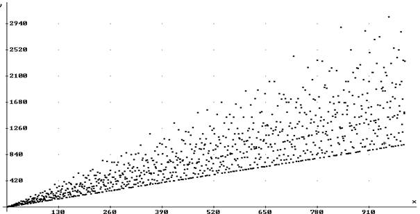 Теперь построим график. По оси Х расположим числа, а по оси Y их сумму делителей (числа от 1 до 1000): Посмотрим, что же у нас получилось: на графике отчётливо просматриваются несколько прямых линий, например, нижняя это – простые числа. Верхняя граница – это наиболее сложные числа (имеющие наибольшее количество делителей) - это не прямая, но и не парабола. Скорее всего, – это показательная функция (у = ах). В мемуарах Эйлера я нашел много интересных мне рассуждений(σ(n) – сумма делителей числа n): Определив значение σ(n) мы ясно видим, что если p – простое, то σ(p)= p + 1. σ(1)=1, а если число n – составное, то σ(n)>1 + n. Если a, b, c, d – различные простые числа, то мы видим: σ(ab)=1+a+b+ab=(1+a)(1+b)= σ(a)σ(b) σ(abcd)= σ(a)σ(b)σ(c)σ(d) σ(a^2)=1+a+a2= σ(a^3)=1+a+a2+a3= И вообще