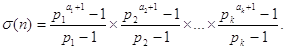 σ(nn)= Пользуясь этим: σ(aqbwcedr)= σ(aq)σ(bw)σ(ce)σ(dr) Например σ(360), 360 = 23*32*5 => σ(23) σ(32) σ(5)=15*13*6=1170. Чтобы показать последовательность сумм делителей приведём таблицу: