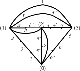 Примем за ноль потенциал узла (0) т.е. f0 = 0. Тогда токи в ветвях, согласно закону Ома: