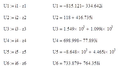 Таблица 2. Сравнение токов. Небольшую разницу в значениях токов можно объяснить разной степенью точности вычислений и округлений. 6 Расчет напряжений на пассивных элементах цепи: Для расчета напряжений на элементах цепи воспользуемся законом Ома в комплексной форме: