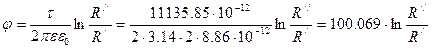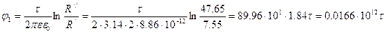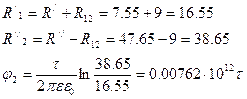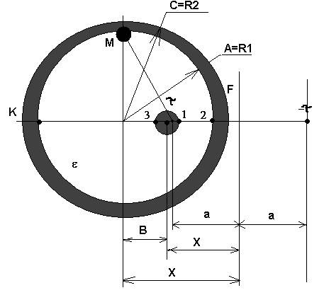U=100B B=11мм С=9мм ε=2 Цилиндрический некоаксиальный конденсатор Задание. 1) Рассчитать ёмкость системы на единицу длины. Найти фиктивный заряд и его геометрическое расположение. 2) Рассчитать и построить график распределения напряжённости электрического поля и потенциала в плоскости KF. 3) Рассчитать и построить векторы электрической индукции, напряжённости и поляризации в т.М. 4) Провести эквипотенциаль с потенциалом, равным 0.25U, гдеU-приложенное напряжение. 1).