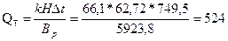 Так как полученная υт'' = 1059°C менее чем на 100 градусов отличается от υт'' = 1000°C, принятой в начале расчетов, то принимаем υт’’ = 1059°С и Iт''=4720 ккал/кг. 5.4.7. Определяется количество тепла, переданное излучением топке по формуле Qл = φ(Qт – I’’т) = 0,9919*(9567,8 – 4720) = 4807 ккал/кг (5.15) 5.4.8. Удельное тепловое напряжение объема топки рассчитывается по формуле qV = Bр*Qрр / Vт = 5923,8*8940 / 297 = 178,3 Мкал/(м2*ч) (5.16) Удельное тепловое напряжение сечения топки в области горелок рассчитывается по формуле