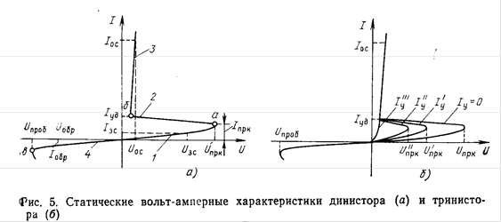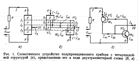 Согласно ГОСТ 15133-77 все переключающие полупроводниковые приборы с двумя устойчивыми состояниями, имеющие три или более р-п перехода, на Рис.. Схематическое устройство полупроводникового прибора с четырехслой- ной структурой (а), представление его в виде двухтранзисторной схемы (б, в) зываются тиристорами. Приборы с двумя выводами (анод и катод) называются диодными тиристорами или динисторами, а приборы с тремя выводами (анод, катод, управляющий электрод) - т р и о д н ы м и - тристорами или тринисторами. Полупроводниковый прибор с четырехслойной структурой может быть моделирован комбинацией двух обычных транзисторов с различными типами проводимости (рис. 1.б.в); VT1 со структурой p-n-pi и VT2 со структурой п-р-п. У транзистора VT1 переход J1 является эмиттерным, а переход J2 коллекторным, у транзистора УТ2 эмиттерным служит переход J3, а коллекторным J2, таким образом, оба транзистора имеют общий коллекторный переход J2 (рис. 1.б). Крайние области четырехслойной полупроводниковой структуры являются эмиттерами, а внутренние-базами и коллекторами составляющих транзисторов VT1 и VT2. База и коллектор транзистора VT` соединяются соответственно с коллектором и базой транзистора VT2, образуя цепь внутренней положительной обратной связи (рис. 1.б.в). Действительно, из рис. l.в видно, что коллекторный ток Ik1 транзистора VT1 одновременно является базовым током Iб2, отпирающим транзистор VT2, а коллекторный ток Ik2 последнего-базовым током Iб1, отпирающим трамзистор VT1, т. е. база каждого транзистора питается коллекторным током другого транзистора. 2. Вольт-амперные характеристики .диодных и триодных тиристоров Режим работы динисторов и тринисторов хорошо иллюстрируется их 'статическими вольт-амперными характеристиками, из которых можно получить представление об основных параметрах этих приборов. На рис. 5,а приведена типовая вольт-амперная характеристика динистора. Здесь по горизонтальной оси .отложено напряжение и между его анодом и катодом (анодное напряжение), а по вертикальной-ток I, протекающий через прибор. Область характеристики при положительных анодных напряжениях образует прямую ветвь, а при отрицательных - обратную ветвь характеристики. На характеристике можно выделить четыре участка, обозначенные на рис. 5,a арабскими цифрами, каждый из которых соответствует особому состоянию четырехслойной полупроводниковой структуры. Участок 1 характеристики соответствует закрытому состоянию (в прямом .направлении) динистора. На этом участке через динистор протекает небольшой ток Iзс -ток прибора в закрытом состоянии. В закрытом состоянии сопротивление промежутка анод-катод прибора велико и обратно пропорционально значению тока Iзс . В пределах участка 1 увеличение анодного напряжения мало влияет на ток, пока не будет достигнуто напряжение (точка а характеристики), при котором в четырехслойной полупроводниковой структуре наступает лавинообразный процесс нарастания тока, и динистор переключается в открытое состояние. Прямое напряжение, соответствующее точке а характеристики, называется напряжением переключения Uпри, а ток, протекающий при этом через прибор,-током переключения Iпри. В процессе переключения динистора в открытое состояние незначительное увеличение тока сопровождается быстрым уменьшением напряжения на аноде прибора (участок 2), так как соста