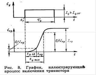 Включение триодных тиристоров постоянным и импульсным токами. На рис. показаны отпирающий сигнал (ток iу), длительность фронта которого для простоты . принята равной нулю, и кривая нарастания прямого тока, на которой отмечены две точки, соответствующие уровням 0,1 и 0,9 установившегося значения тока Iпр. Время, необходимое для того, чтобы ток тринистора достиг уровня 0,1 установившегося значения, называется в р е м е н е м з а д е р ж к и п о управля- ющему электроду tу.зд. Временной интервал между уровнями 0,1 и 0,9 установившегося значения тока называется в р е м е н е м н а р а с т а н и я п р я м о г о т о к а tпр. За точкой 0,9 Iпр ток растет значительно медленнее, это-время распространения тока на всю проводящую площадь перехода. Уровни, по которым отсчитываются указанные интервалы, показаны на рис. Время включения по управляющему электроду тринистора t у.вкл, которое приводится в справочных данных: t у.вкл=t у.зд+t нр Обычно t у.зд в несколько раз больше t нр и практически определяет время t у.вкл . В течение времени задержки t у.зд во внутренней р-области накапливаете минимальный заряд, достаточный для развития лавинооблазного процесса нарастания тока через структуру. В этом интервале времени через тринистор про- ходит небольшой ток, в основном определяемый током управляющего электрода (16). Процесс включения среднего перехода I2 (рис. 1.а) только развивается, и, если в течение промежутка времени t у.зд снять управляющий сигнал, три- нистор возвратится в закрытое состояние. Время задержки в некоторых пределах зависит от тока управления Iy: возрастает при уменьшении тока Iу и несколько сокращается при увеличении тока до значения импульсного отпирающего тока Iу.от.и. При токах Iу > Iу.от.и задержка t у.зд практически не меняется. В конце интервала времени t у.зд прямой ток достигает значения тока удер- экания, и в полупроводниковой структуре начинает развиваться лавинообразный процесс нарастания тока.. При больших токах управления, имеющих фронт с крутизной несколько ампер в микросекунду, зона начальной проводимости среднего перехода увеличивается. Скорость распространения процесса включения в среднем (коллекторном) переходе зависит от конструкции управляющего электрода структуры и составляет примерно 1 ... 10 мм/мкс. Время включения по управляющему электроду t у.вкл у маломощных три- нисторов составляет 1 ...2 мкс, у приборов средней мощности доходит до 10мкс. Приборы, специально предназначенные для импульсного режима работы, имеют меньшее значение t у.вкл . Например, у тринисторов КУ104 оно не превышает 0,3 мкс, а у тринисторов КУ216 0,15 мкс. Для уверенного отпирания тринистора от источника постоянного тока значения управляющего тока Iу и управляющего напряжения Uу выбираются из условий Iу>=Iу.от Uу>=Uу.от Iу Uу <= Ру где Iу.от - постоянный отпирающий ток управления: Uу.от - постоянное отпирающее напряжение управления; Ру - допустимая средняя мощность, рассеиваемая на управляющем электроде. В цепях постоянного тока тринисторы могут отпираться различными спосо- бами. Конкретный способ управления во многом зависит от функций устройства. Один из наиболее простых способов, при котором источник анодного питания Uпит одновременно используется и для получения необходимого отпирающего тока в цепи управляющего электрода, иллюстрируется схемами на рис.