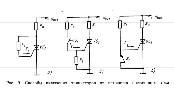 В схеме рис. 9а тринистор включается сразу при подаче анодного питания, если суммарное сопротивление анодной нагрузки и резистора R1 обесточивает ток управляющего электрода Iу=Uпит/(Rн+R1)>=Iу.от. После открывания прибора напряжение на аноде снижается до значения Uос, все напряжение источника питания практически оказывается приложенным к нагтрузке и в цепи управляющего электрода начинает протекать незначительный ток, равный Iу=Uпит/R1. Для отпирания тринистора в устройстве, показанном на рис. 9,6, необходимо кратковременно нажать кнопку S1. Если при этом значение тока Iу, прете- кающего в цепи управления, удовлетворяет приведущему условию , то тринистор переключится в открытое состояние. Обычно для надежного включения достаточно через цепь управляющего электрода пропустить ток Iу=(1…1,1)Iу.от, для чего сопротивление резистора R1 (рис. 9,6), ограничивающего ток управляющего электрода, рассчитывается по формуле R1 = (0,9 ... 1) Uпит/Iу.от (1) Для схемы рис. 9.в рассчитамное по формуле (1) сопротивление резистора Я, должно быть уменьшено на значение сопротивления анодной нагрузки Rн. Резистор R2 (рис. 9,6) обеспечивает гальваническую связь управляющего электрода с катодом, что увеличивает устойчивость работы тринистора в ждущем режиме (особенно при повышенной температуре окружающей среды). Рекомендуемое сопротивление этого резистора указывается в справочных данных некоторых типов тринисторов. Обычно у маломощных приборов оно составляет несколько сотен ом, а у приборов средней мощности-примерно 50...100 Ом. В схеме рис. 9.в тринистор открывается и через нагрузку начинает проходить ток при размыкании выключателя .S1. Такой способ отпирания тринистора менее экономичен, чем два предыдущих, поскольку от источника питания постоянно потребляется ток, равный Uпит/R1; при закрытом приборе он протекает через замкнутые контакты S1, а при размыкании выключателя-через цепь управляющий электрод-катод тринистора. Сопротивление резистора R1 рассчитывается по формуле (1).