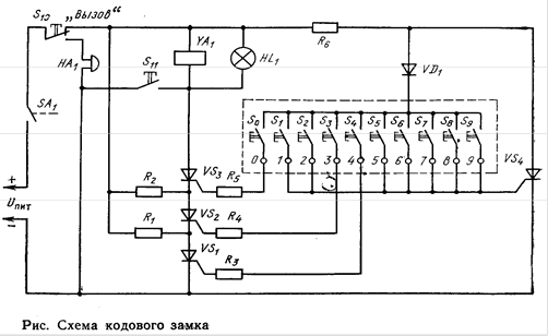 На рис. приведена схема устройства, выполняющего функции дверного кодового замка, которая иллюстрирует многочисленные возможности практического использования выключателей на тринисторах с кнопочным управлением. Основу замка составляет переключатель на трех тринисторах VS1-VS3, соединенных последовательно. В анодную цепь тринистора VS3 включена обмотка электромагнита YA1, сердечник которого служит запором для двери. Цепочка последовательно соединенных тринисторов может быть переключена в проводящее состояние только при отпирании каждого из них в определенной последовательности: первым должен быть открыт тринистор VS1, вторым – VS2 и, наконец, - VS3 . Открываются тринисторы с помощью кнопок, оправляющие электроды три- нисторов могут быть подсоединены к контактам любых трех кнопок S0-S9 пульта, установленного на стене с наружной стороны двери. При показанном на схеме соединении управляющих электродов тринисторов с кнопками кодом замка является число 430, и поэтому первой должна быть нажата кнопка .S4, затем-кнопка S3 и последней-кнопка S0. Сопротивления резисторов R1 и R2 обеспечивают выполнение условия Iпр>Iуд, поэтому после включения тринисторов VS1 и VS2 при кратковременном нажатии кнопок S4 и S3 соответственно эта приборы остаются в проводящем состоянии. После нажатия кнопки S0 включается тринистор VS3, напряжение источника питания Uпит через замкнутые контакты выключателя SA1 и кнопки S10 подается на обмотку электромагнита YA1, при этом одновременно загорается сигнальная лампа HL1. Электромагнит втягивает сердечник и таким образом открывает замок двери. При открывании двери контакты выключателя SA1 размыкаются и разрывают цепь питания, тринисторы вновь выключаются, и после закрывания двери устройство возращается в исходное состояние . Тринистор VS4 служит для того, чтобы исключить возможность открыть замок подбором кода. Контакты кнопок, не использованных в коде, соединены между собой и подключены к управляющему электроду тринистора VS4. Если при попытке подобрать код будет нажата любая из этих кнопок, то тринистор VS4 откроется и замкнет цепь управления тринисторов VS1-VS3, и тогда ни один из них уже невозможно будет включить. Сопротивление резистора R6 рассчитывается по формуле Uпит/R6>Iуд поэтому тринистор VS4 после отключения остается в проводящем состоянии. Такой же результат будет и при одновременном нажатии всех кнопок, так как тринистор VS4 откроется раньше, чем три последовательно соединенных тринистора VS1-VS3. Полезно обратить внимание на то, что этому обстоятельству способствует также и большее значение управляющего тока прибора VS4 по сравнению с тринисторами VS1-VS3. Чтобы устройство возвратить в исходное состояние после включения тринистора VS4, следует нажать кнопку S10 «Вызов», контакты которой разрывают цепь питания тринистора VS4, и последний закрывается. Одновременно замыкающие контакты этой кнопки включают звонок HA1 звуковой сигнализации. Кстати, этой кнопкой можно пользоваться просто как кнопкой звонка, если ход замка не известен. С помощью кнопки S11 замок можно открыть дистанционно из помещения. При нажатии этой кнопки тринисторы VS1-VS3 замыкаются накоротко и напряжение питания подается на обмотку электромагнита YA1. Кнопку S11 следует держать нажатой до тех пор, пока дверь не будет открыта. Для изменения кода замка провода, идущие от уп