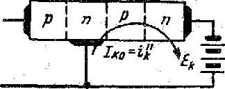 рис.1 Схематическое изображение биполярного транзистора типа р-п-р-п с двойным переходом (ловушкой) в коллекторе. часть транзистора, состоящую из трех областей, можно рассматривать как самостоятельный транзистор типа п-р-п, подключенный эмиттером и коллектором к источнику питания. База этого условного транзистора к схеме не подключена, транзистор работает в режиме нулевого тока базы (рис.1). Так как в данном случае мы имеем дело не с транзистором р-п-р, а с транзистором п-р-п, то очевидно, что коллектором этого условного транзистора должен быть электрод, к которому подводится положительное напряжение, а эмиттером — электрод, к которому подводится отрицательное напряжение. Другими словами, полярность приложенного к условному транзистору напряжения такова, что средний р-п переход имеет смещение в обратном направлении и на нем падает почти все напряжение источника питания, тогда как правый р-п переход имеет смещение в прямом направлении. Обозначая двумя штрихами величины, относящиеся к этому условному транзистору, запишем I’’к= I’’э =(B’'0+1)* I’’к0