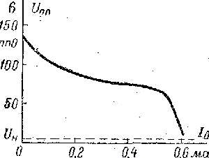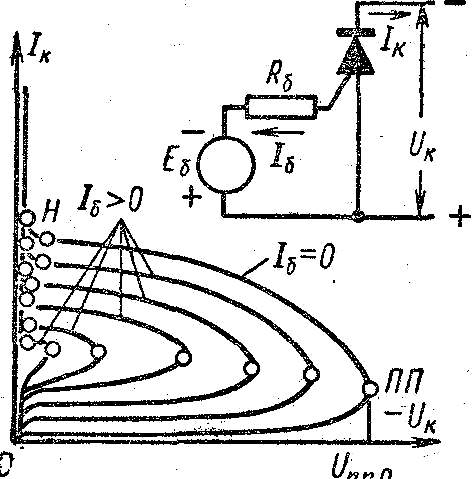 Рис. 6. Вольт-амперные характеристики тринистора при положительном токе базы. Решая (10) относительно M и используя выражение для характеристики в области ионизации, не-. трудно представить вольт-амперные характеристики тринистора в форме Uк (Iк): Uк =Um[(1- a Iк + Iк0 +a1Iб)/ Iк]1/n (11) В частном случае, при Iб = 0, получается характеристика динистора (3). Выражение (11) ясно показывает, что данному току Iк соответствует тем меньшее напряжение Uk, чем больше ток Iб (рис.6). Рассмотрим отдельные участки этого семейства. На начальном участке мы имеем по существу семейство характеристик обычного транзистора в схеме ОЭ. Координаты точек прямого переключения определяются, как и в динисторе, условием dUk/dIk, == 0. Анализ показывает, что ток Iп.п возрастает с увеличением тока базы. На рис. 7 показана пусковая характеристика тринистора, т. е. зависимость Uп.п (Iб). Координаты точки Н, в которой напряжение на коллекторном переходе П2 падает до нуля, определяются условием Uk = 0 в формуле (11). Так же как в динисторе, можно в этой точке считать a @ 1 и определять ток Iн из условия a=a1(Iн + Iб)+ a3(Iн)==1. (12) Отсюда видно, что увеличение тока Iб, а значит, и коэффициента a1 сопровождается уменьшением коэффициента a3, а значит, и тока Iн. Соответственно несколько меньше будет и ток Io.п в точке обратного переключения. Параметры тринистора в открытом состоянии практически не отличаются от параметров динистора, поскольку ток Ik в этой области значительно больше тока Iб, и поэтому токи обоих крайних переходов почти одинаковы.