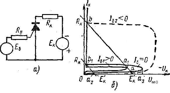 Рис. 8. Вольт-амперные характеристики тринистора при отрицательном токе базы. Iб= -I0= -Eб/Rб (13) которую можно считать параметром соответствующей характеристики. Если в формуле (11) положить a1=0 и a= a3 и подставить Ik = I0, можно получить напряжение отпирания эмиттерного перехода: U0 =UM [1-(a3 I0 + Ik0)/ I0]1/n (14) Из формулы (13) видно, что ток I0, равный параметру кривой (току Iб), возрастает вместе с модулем параметра. Что касается напряжения U0, то оно несколько увеличивается. Ток обратного переключения можно найти из уравнения (12), если считать Iн@Iо,п В случае малых отрицательных токов базы ток Iо,п заметно больше тока I0@ôIбô. При больших токах ôIбô эта разница уменьшается. Отношение Iо,п/ôIбô можно назвать коэффициентом усиления при выключении; он определяется .величиной а1/(а-1) и в обычных тринисторах не превышает (1). Очевидно, что с точки зрения управляемости при запирании суммарный коэффициент передачи а не следует делать намного большим единицы. На рис. 9, а показана типичная схема включения тринистора, а на рис. 9, б - ее рабочий цикл. Пусть Ek < Uп,по. Тогда в запертом состоянии и при токе Iб = 0 рабочей точкой будет точка а. Увеличивая ток Iб до значения Iб1, мы вызовем скачкообразный переход рабочей точки из положения a1 в положение b. В этом открытом состоянии тринистора падение напряжения на нем составляет всего лишь около 1 в, как и в динисторе. Поэтому ток нагрузки практически равен Ek/Rk. Для того чтобы запереть тринистор, т. е. вернуться в точку а, нужно либо уменьшить рабочий ток до величины Ik < Io.п