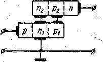 Следовательно, изменение тока базы условного транзистора должно привести к изменению тока в выходной цепи, в 1/ (1 - a’’0 ) раз большему. Если подать смещение в прямом направлении на левый р-п переход, то он будет инжектировать дырки в среднюю n-область. Дырки будут распространяться диффузионно в направлении среднего р-п перехода, втягиваться его полем и выбрасываться в среднюю р-область. Три левых слоя работают при этом, как транзистор типа р-п-р, включенный с общей базой. Ток эмиттера этого левого условного транзистора I’э будет, очевидно, равен току эмиттера Iэ структуры р-п-р-п. Таким образом, получаем, что структура р-п-р-п представляет собой как бы два наложенных один на другой плоскостных транзистора, из которых первый является транзистором р-п-р, включенным по схеме с общей базой, а второй — транзистором п-р-п, включенным по схеме с общим коллектором. Рис а, б Так как области n1 и n2 практически представляют собой одну и ту же n-область, связанную выводом базы с заземленной точкой, то мы имеем все основания заземлять отдельно каждую из этих областей, оставив области p1 и р2 соединенными проводником. Усиление по току структуры в целом определяется соотношением