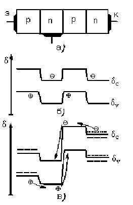 Рис. 2. Диаграммы положения границ зон и прохождения носителей заряда в структуре р-п-р-п: а—схематическое изображение структуры р-п-р-п, б - положение границ зон при отсутствии внешних напряжений, в—положение границ зон при подаче, на коллектор отрицательного, а на эмиттер положительного смещения относительно базы
