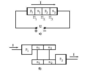 Коэффициент усиления по току, превышающий единицу, при соответствующем направлении входного и выходного тока обеспечивает работу прибора в ключевом режиме. Биполярный транзистор при включении его по схеме с общей базой имеет необходимые направления токов, но его коэффициент усиления по току a0 < 1. При включении по схеме с общим эмиттером коэффициент усиления по току превышает единицу (B0 > 1), но не соблюдаются необходимые направления токов. В четырехслойной тиристорной структуре выполняются оба эти условия. Динистор. Рассмотрим работу диода состоящего из четырех чередующихся слоев p1-n1-p2-n2 (рис. 5-8, а). Если подать на него не очень большое напряжение U плюсом на слой р1 и минусом на слой n1, то потечет ток, как показано стрелкой. В результате переходы П1 и П2 будут работать в прямом направлении, а переход П2 - в обратном. Таким образом, получится как бы сочетание двух транзисторов в одном приборе (рис.5-8, б) (Комбинация транзисторов р-п-р и п-р-п, показанная на рис. 5-8, б, действительно обладает свойствами динистора и может быть использована на практике.): одним транзистором является комбинация слоев p1-n1-p2, другим - комбинация слоев п1-р2-n2. Слои p1 и n2 являются эмиттерами, n1 и p2, — базами для одного транзистора и коллекторами для второго. Во избежание путаницы их называют базами. Переход П2 называют коллекторным.