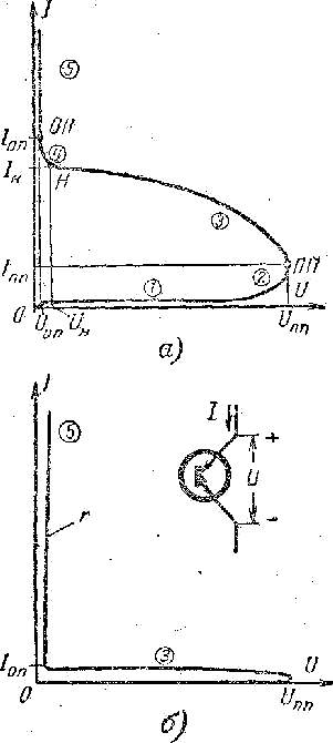 Рис. 4. Вольт-амперная характеристика динистора. а-начальный участок; б-полная кривая. Происхождение отрицательного участка на характеристике динистора обусловлено той же причиной, что и в лавинном транзисторе. А именно, у обоих приборов на этом участке задан постоянный ток базы (у динистора он равен нулю). Поэтому должно выполняться соотношение dIk = dIэ, т. е. дифференциальный коэффициент а должен быть все время равен единице. С ростом тока величина a стремится возрасти, но это возрастание предотвращается уменьшением напряжения на коллекторном переходе, т. е. ослаблением ударной ионизации. Такой же вывод следует из формулы (2), в которых знаменатель не может быть отрицательным, и, следовательно, начиная с некоторой рабочей точки, увеличение интегрального коэффициента a должно сопровождаться уменьшением коэффициента M,т. е. уменьшением коллекторного напряжения. Однако, несмотря на определенное сходство с лавинным транзистором, имеет принципиальную особенность. Эту особенность легко показать, если представить вольт-амперную характеристику в форме U(I). Подставив выражение для характеристики в области ионизации в (2) и решив последнее относительно напряжения, получим: U=UM[1-(a*I+Ik0)/I]1/n (3) У лавинного транзистора, у которого a < 1 при любом токе, напряжение Uk всегда имеет конечную величину. У динистора, у которого суммарный коэффициент a == a1+a3 может превышать единицу, напряжение U (точнее, напряжение на коллекторном переходе) делается равным нулю при некотором конечном токе /. При еще большем токе формулы (2) и (3) становятся недействительными, так как коллекторный переход оказывается смещенным в прямом направлении и механизм работы динистора качественно изменяется. Рассмотрим отдельные участки характеристики, показанной на рис. 4. Начальный участок 1 характерен очень малыми токами, при которых можно считать a @ 0. Сопротивление на этом участке весьма велико, поэтому заданной величиной всегда бывает напряжение, а ток можно найти по формуле (2). На переходном участке 2 рост напряжения замедляется, а сопротивление резко падает. Эти изменения являются следствием увеличения коэффициента а и могут быть легко оценены с помощью выражения (3). В конце второго участка, в точке ПП, сопротивление обращается в нуль, а затем (при заданном токе) становится отрицательным. Координаты точки прямого переключения определяются условием dU/dI = 0. Напряжение Uп.п обычно близко к величине Um и для разных типов динисторов лежит в широких пределах от 25—50 до 1 000—2 000 в ( Эти цифры характерны для серийных динисторов. Можно изготовить аналогичные приборы с рабочими напряжениями всего в несколько вольт). Ток Iп.п лежит в пределах от долей микроампера до нескольких миллиампер в зависимости от материала и площади переходов. На отрицательном участке 3 характеристика по-прежнему описывается формулой (3), которую, однако, можно упростить, полагая aI > Ik0. Тогда U@UM(1-a)1/n (4) где a увеличивается с ростом тока. Дифференцируя (4) по току, получаем сопротивление на этом участке: r= - UM (da/dI) / n(1-a)[n-1]/n (5) Отсюда видно, что величина сопротивления должна существенно меняться с изменением тока. Характер этого изменения определяется функцией a(I) и в общем случае может быть немонотонным. Однако чаще всего сопротивление r возрастает (по модулю) с ростом тока. Средняя величина ôrô между точками ПП и ОП лежит обычн